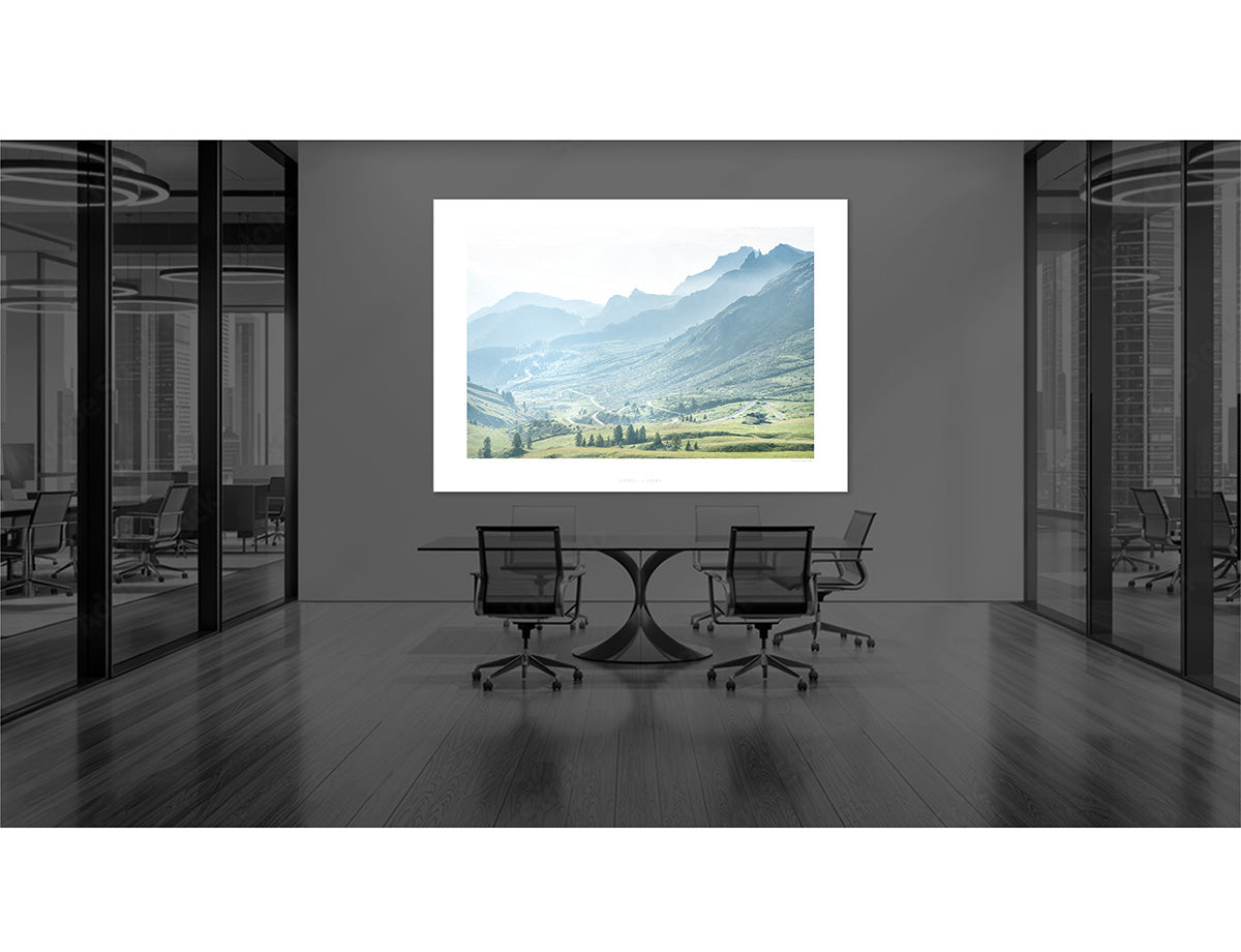 The morning mist slowly disperses from the Passo Pordoi and the road to Arabba.